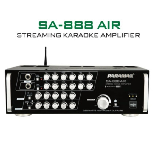 PARAMAX SA-888 AIR thừa hưởng đầy đủ nền tảng ưu tú từ ampli SA-999 AIR, sản phẩm được thiết kế để hoạt động ở mức tối đa 350 Watt, đi cùng giá bán “dễ chịu” giúp tăng thêm lựa chọn cho người dùng khi cần ampli phù hợp để phối ghép với các mẫu loa có công suất vừa và nhỏ.Cùng khả năng xử lý ưu việt và độ ổn định trong truyền dẫn tín hiệu của mạch AIR Module, PARAMAX SA-888 AIR và SA-999 AIR là những ampli karaoke Bluetooth chuẩn không nén aptX hiếm hoi trên thị trường để Bạn lựa chọn khi có thế mạnh về chất âm trung thực: tiếng bass chắc gọn, dải treble tơi nhuyễn và chi tiết đồng thời thể hiện được cấu trúc âm thanh chặt chẽ, nhạc tính.
