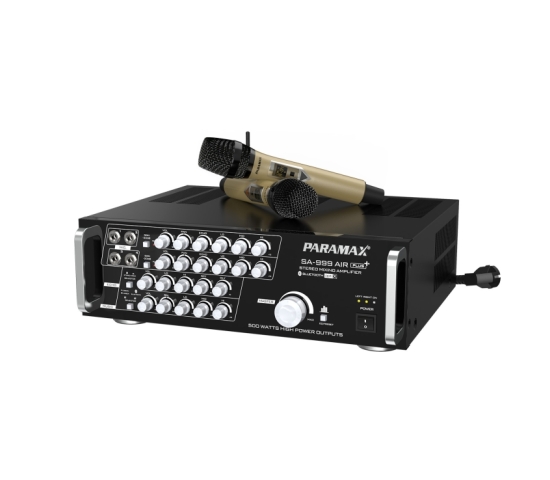 • SA-999 AIR Plus là amply Bluetooth tích hợp sẵn bộ micro không dây cao cấp UHF 40 kênh tần số. Thiết kế amply liền micro không dây đầu tiên của PARAMAX tham gia thị trường để đáp ứng nhu cầu của các gia đình về trọn bộ âm thanh sử dụng cho karaoke và nghe nhạc, với không gian giải trí tối đa lên đến 40m2. Công suất hoạt động của amply được thiết lập ở mức 500w, vẫn giữ thế mạnh từ ưu điểm kết nối Bluetooth chuẩn aptX cùng khả năng xử lý, khôi phục trọn vẹn tín hiệu âm thanh gốc, và tiện ích nay được mở rộng với bộ micro không dây UHF nhiều tính năng tự động, thiết kế đẹp mắt tích hợp sẵn theo máy.
