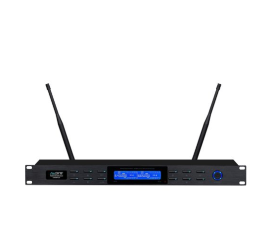 Các chi tiết ở mặt trước đầu thu bao gồm: màn hình hiển thị tần số tiếp sóng micro, màn hình LCD. Hai bên là nút điều chỉnh từng micro riêng biệt. Ngay bên cạnh nút là đèn led báo hoạt động của micro. Đèn sẽ hoạt động khi đầu thu dò đúng tần số sóng của micro đó. Góc trái Micro Không Dây AVPRO KP550II là logo AVPRO. Góc phải Micro Không Dây AVPRO KP550II được bố trí nút nguồn có gắn đèn led hiển thị hoạt động.