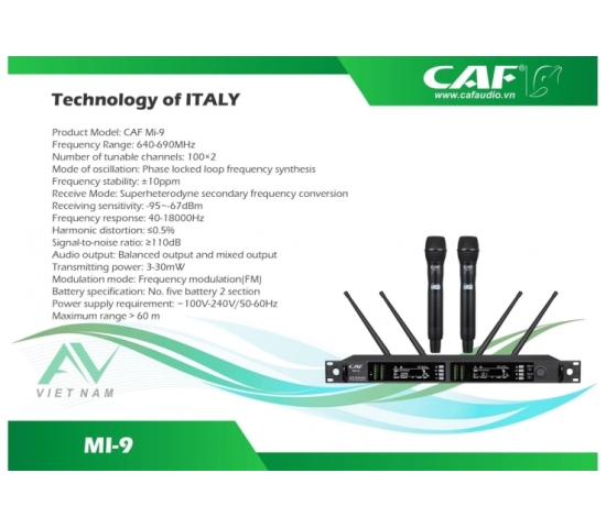 Với khả năng thu nhận sóng ở khoảng cách xa lên đến trên 60m và xấp xỉ 100m, micro CAF Mi-9 (Pro) luôn được tin dùng trong các chương trình biểu diễn chuyên nghiệp trong nhà và ngoài trời.