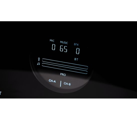 Mặt trước máy là một màn hình hiển thị hình tròn hiển thị đầy đủ thông số đang hoạt động, thao tác cực đơn giản với 3 núm volum được bố trí khoa học. dùng để điều chỉnh âm lượng của nhạc nền, micro và effect. Ngoài ra còn dùng để chuyển đổi các cấu hình âm thanh đã được cài sẵn hoặc lựa chọn thiết bị đầu vào mà không cần phải sử dụng máy tính.