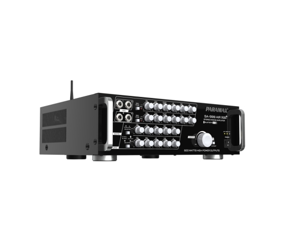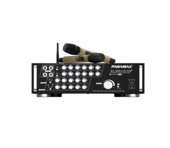 • SA-999 AIR Plus là amply Bluetooth tích hợp sẵn bộ micro không dây cao cấp UHF 40 kênh tần số. Thiết kế amply liền micro không dây đầu tiên của PARAMAX tham gia thị trường để đáp ứng nhu cầu của các gia đình về trọn bộ âm thanh sử dụng cho karaoke và nghe nhạc, với không gian giải trí tối đa lên đến 40m2. Công suất hoạt động của amply được thiết lập ở mức 500w, vẫn giữ thế mạnh từ ưu điểm kết nối Bluetooth chuẩn aptX cùng khả năng xử lý, khôi phục trọn vẹn tín hiệu âm thanh gốc, và tiện ích nay được mở rộng với bộ micro không dây UHF nhiều tính năng tự động, thiết kế đẹp mắt tích hợp sẵn theo máy.