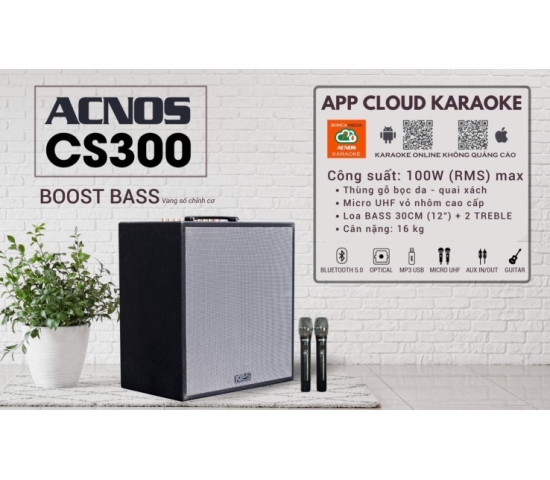 ACNOS CS300 thiết kế thùng gỗ có quai xách. Công suất thực RMS 100W (max) - Công suất âm thanh PMPO 600W (max) cho âm thanh sống động. Hệ thống 04 loa trong 1 bao gồm 02 loa BASS 12"(30cm) và 2 loa TWEETER. Micro UHF không dây nhẹ hơi lọc âm tốt, nâng giọng hát karaoke chuyên nghiệp