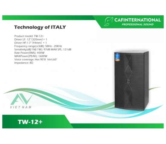 Là dòng loa có chất lượng âm thanh tốt được đánh giá cao trong các dòng loa CAF Audio có tiếng trung mềm mượt ấm áp, bass trắc mạnh, tiếng tress sáng rõ CAF TW-12+ đã được lắp đặt hầu hết trong các phòng hát karaoke cao cấp thậm chí nhiều gia đình cũng đã mua và sử dụng, bộ loa karaoke gia đình lý tưởng được biết đến nhờ sự nổi tiếng của chất lượng âm thanh cùng độ bền vượt thời gian bên cạnh đó là mẫu mã với kiểu dáng đẹp hiện đại.