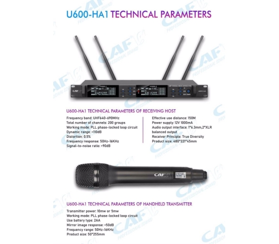 CAF U600-HA1 bộ micro không dây chuyên nghiệp chính hãng CAF dành cho khách hàng sử dụng cho mục đích cần một sản phẩm cho chất lượng âm thanh chuyên nghiệp.