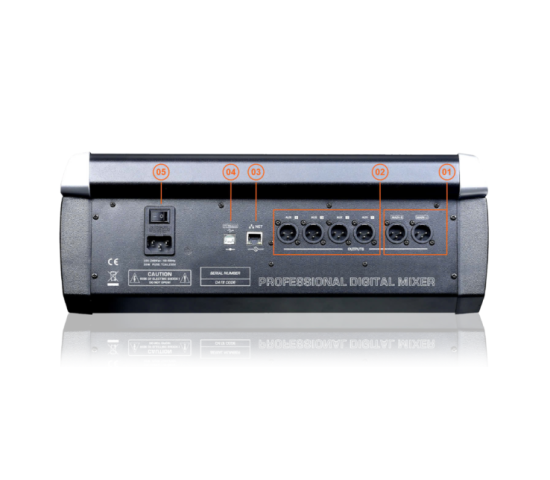 12 kênh đầu vào: 8 kênh Mic / Line (giao diện cân bằng XLR / TRS), 1 đầu vào dòng âm thanh nổi, 1 kênh USB Media âm thanh nổi (phát lại đĩa U hoặc âm thanh Bluetooth) hoặc phát lại card âm thanh PC. |